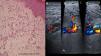 On the left, a histologic image showing the proliferation of capillaries in the deep dermis and papillary dermis, fibrosis, extravasated red blood cells, hemosiderin deposits, and tortuous vessels. On the right, Doppler ultrasound images showing an arteriovenous fistula of the posterior tibial artery (A), anterior tibial artery (B), and arterialized venous flow distal to the anterior tibial vein (C).