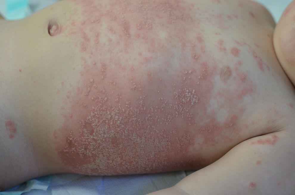 A 13-month-old infant, born at term to non-consanguineous parents and with 3 healthy siblings, was evaluated in Dermatology due to a 1-month history generalized cutaneous eruption preceded by fever and otitis externa. He had previously experienced several episodes of erythematous–scaly plaques on the trunk and skin folds and was already being followed in Otolaryngology for recurrent otitis externa and in Ophthalmology for recurrent blepharitis.