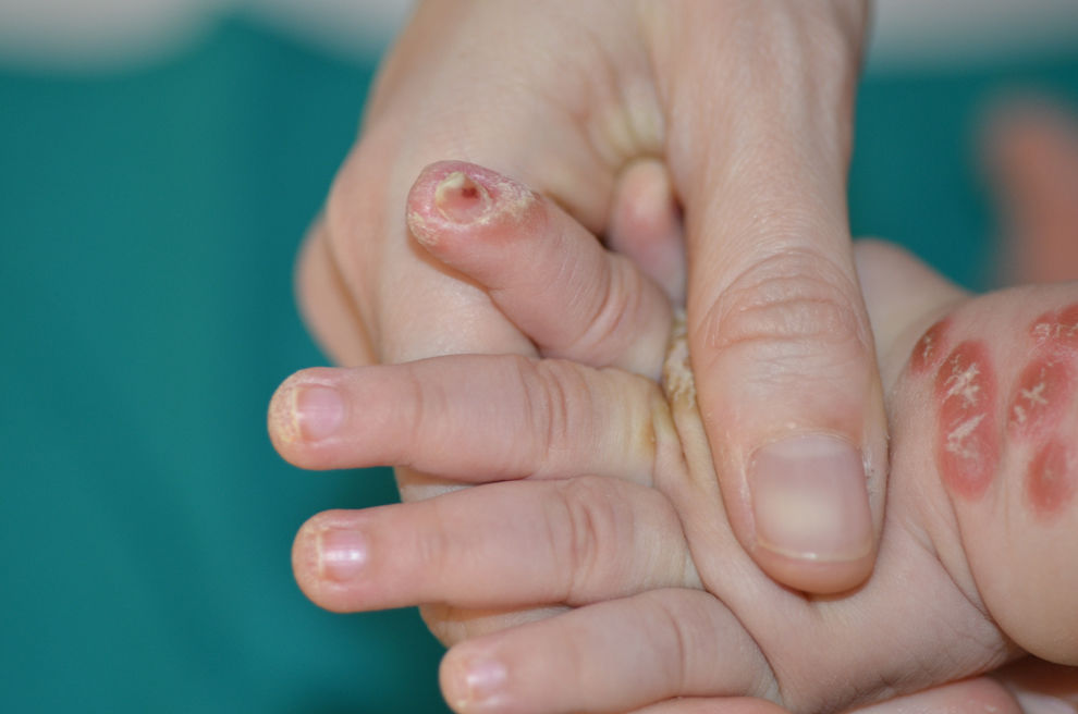 Additional testsDuring follow-up, immunodeficiency was ruled out by measuring immunoglobulins (IgG, IgA, IgM), complement (C3 and C4), and lymphocyte subpopulations. Zinc levels were normal, ruling out acrodermatitis enteropathica. Cultures from the lesions tested positive for Staphylococcus aureus, Streptococcus agalactiae, and Candida albicans.