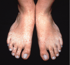 FIG. 2.--En el dorso de los pies se ven las mismas lesiones que en las manos, asintomáticas, que comenzaron hacia los 10 años.