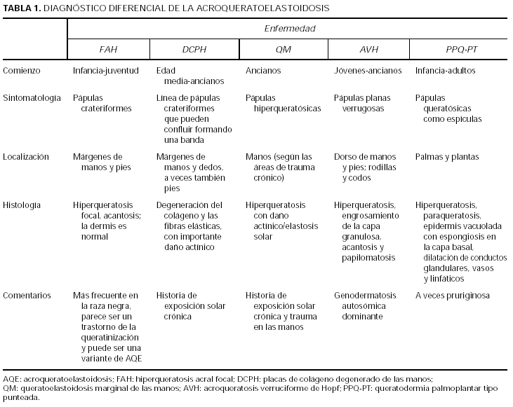 Los principales diagnósticos diferenciales son (tabla 1) la hiperqueratosis focal acral12, las placas de colágeno degenerado de las manos13, la queratoelastoidosis marginal de las manos14, la acroqueratosis verruciforme de Hopf15 y la queratodermia palmoplantar punteada16. Los casos de hiperqueratosis focal acral son clínicamente idénticos a los de acroqueratoelastoidosis, pero sin alteraciones dérmicas, incluso usando microscopio electrónico. Las placas de colágeno degenerado y la queratoelastoidosis marginal de las manos son dos cuadros estrechamente relacionados que afectan sobre todo a personas de edad avanzada; el primero representa una forma localizada de elastosis actínica de la dermis de las manos, y el segundo son lesiones degenerativas de las manos descritas en trabajadores manuales australianos con historia de exposición crónica al sol. Para unificar estos cuadros tan parecidos clínicamente se ha propuesto17 el término de acroqueratodermias papulosas marginales, que a su vez podrían ser clasificadas de un tipo hereditario con o sin elastorrexis (acroqueratoelastoidosis e hiperqueratosis focal acral, respectivamente), y un tipo adquirido (que incluiría las placas de colágeno degenerado y la queratoelastoidosis marginal de las manos).