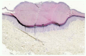 Histológicamente, las pápulas muestran hiperqueratosis ortoqueratósica y acantosis. En la dermis se observan fibras elásticas fragmentadas y en menor número de lo habitual; a veces, estos cambios dérmicos sólo son evidentes al microscopio electrónico2-4.