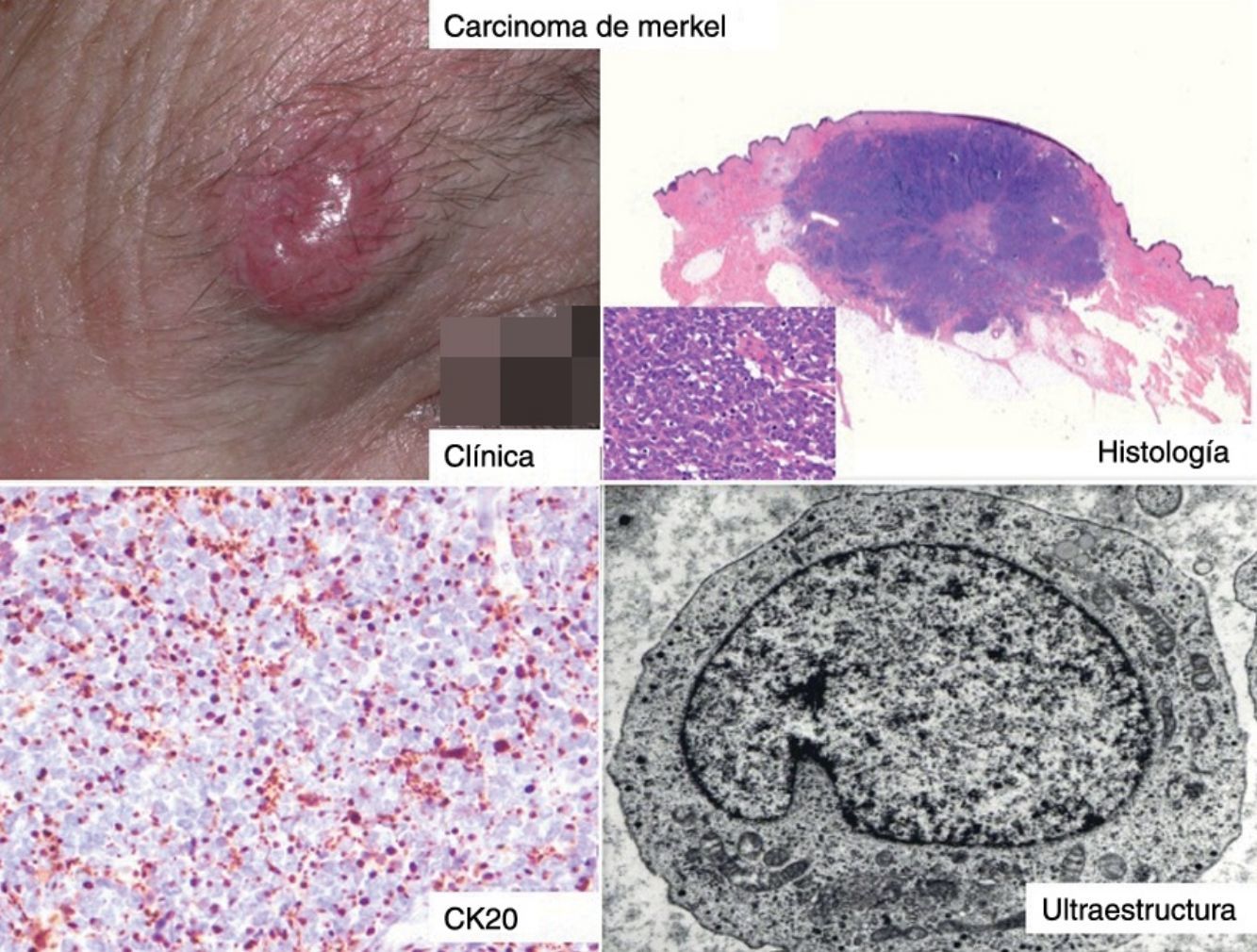 El carcinoma de células de Merkel (CCM) es un tumor poco frecuente, con un curso evolutivo muy agresivo, que con frecuencia origina recidivas locorregionales y metástasis. Asienta predominantemente en zonas fotoexpuestas en pacientes ancianos. Su incidencia se ha cuadriplicado en las últimas décadas debido al envejecimiento de la población y a un mayor diagnóstico gracias al uso de técnicas inmunohistoquímicas. La patogénesis del CCM no está clara, pero la radiación ultravioleta, la inmunosupresión y la presencia del poliomavirus MCPyV en el genoma del tumor parecen desempeñar un papel fundamental en el desarrollo de esta neoplasia.