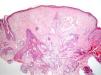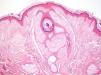 ClínicaManifestaciones cutáneasClínicamente, en la piel, el síndrome Birt-Hogg-Dubé se caracteriza esencialmente por la presencia de fibrofoliculomas y/o tricodiscomas que suelen presentarse alrededor de la tercera y cuarta décadas de la vida. Parece ser que los tricofoliculomas, tricodiscomas y acrocordones descritos clásicamente como la «tríada» característica del síndrome Birt-Hogg-Dubé formarían parte de un mismo espectro histopatológico y clínico, el fibrofoliculoma. Clínicamente, estas lesiones son prácticamente indistinguibles y se presentan como múltiples pápulas blanquecinas, de aspecto cupuliforme, de escasos milímetros de diámetro localizadas principalmente en la nariz, la frente y las mejillas, aunque también pueden localizarse en el cuello y el tronco3 (fig. 1). Histológicamente, el fibrofoliculoma es una lesión típicamente vertical o perpendicular a la epidermis, ya que está centrada en el folículo piloso. Se caracteriza por la presencia de largas y delgadas proyecciones epiteliales, del tipo del manto folicular, que en ocasiones terminan en glándulas sebáceas maduras, y que están típicamente rodeadas por un estroma fibrovascular con variable componente mixoide (fig. 2). El tricodiscoma es, a diferencia del anterior, una lesión orientada horizontalmente, es decir, paralela a la epidermis, constituida exclusivamente por un estroma idéntico al fibrofoliculoma, rodeado en la base por unidades folículo-sebáceas (fig. 3). Se considera que el tricodiscoma es una forma tardía de fibrofoliculoma4.