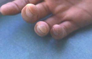 Fig. 1.--Ampollas en pulpejos de los últimos dedos de mano derecha.