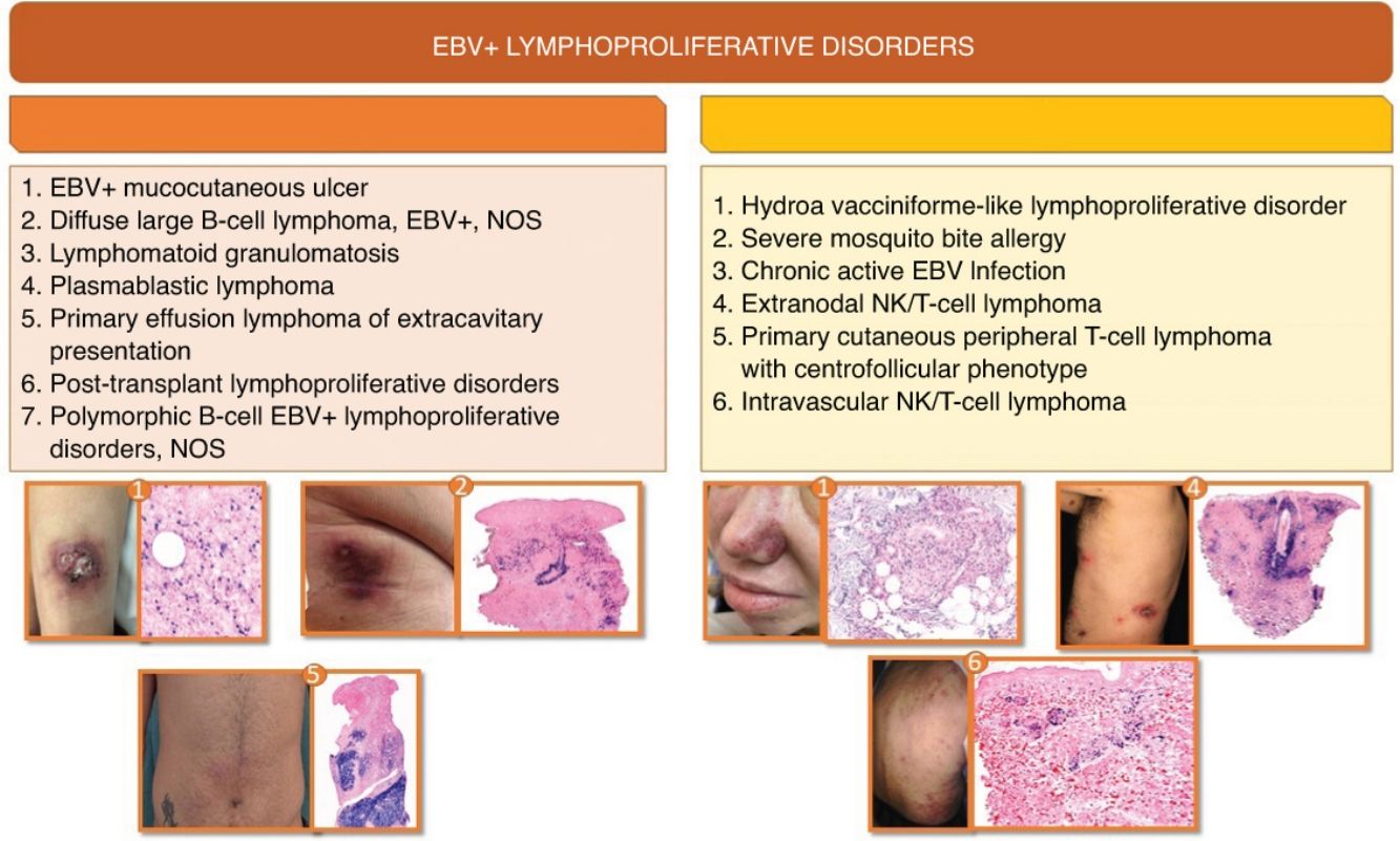 EBV-related T-lymphoproliferative disorders and lymphomas with cutaneous involvementIn the skin, EBV+ T- or NK-cell LPDs are very rare, collectively accounting for <2% of primary cutaneous lymphomas,1 with higher incidence rates in Asian and Latin American populations, suggesting a possible genetic predisposition. Unlike EBV+ B-cell lymphomas, immunosuppression does not appear to play a significant role in the development of these lymphomas.64