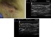 Hidradenitis suppurativa. A, Long erythematous lesion in the right armpit. The red circle shows the clinically evident area. The blue lines show the affected area as seen by ultrasound. B, Ultrasound image showing an underlying fistulous tract. C, Mild inflammatory activity evidenced by Doppler ultrasound.