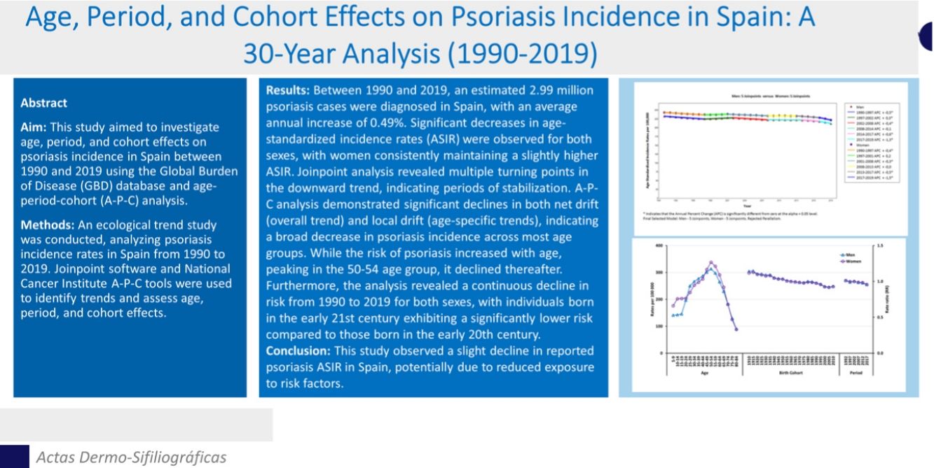 Estudios previos han analizado la incidencia de la psoriasis utilizando predominantemente la edad sin ajustar, y rara vez han examinado los efectos de la edad, el periodo de tiempo y la cohorte. La tendencia descendente plantea interrogantes sobre su correlación con los cambios entre los periodos naturales o cohortes de nacimiento, independientemente del envejecimiento de la población. El análisis edad-periodo-cohorte (A-P-C) está emergiendo como una herramienta importante para descubrir efectos independientes sobre la incidencia de la enfermedad al considerar la edad del paciente, el periodo de tiempo, la cohorte de nacimiento y otros factores que tengan alguna influencia y que suelen omitirse en los estudios transversales.