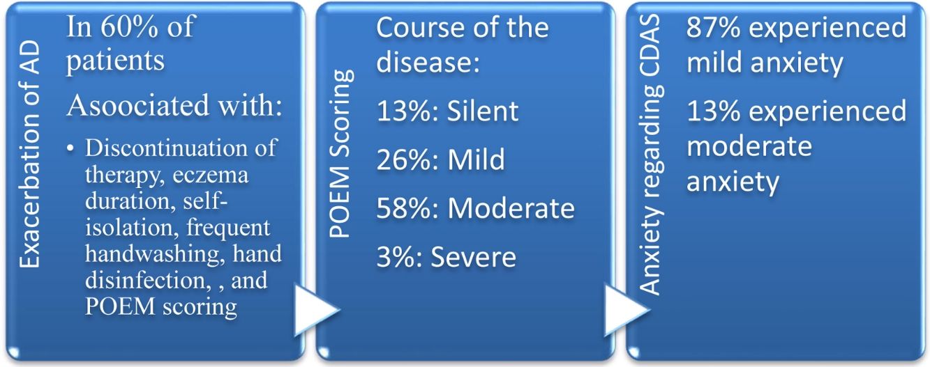 Out of 100 patients, 43 were male, and 57 were female (mean age±SD: 45.85±16.90). Sixty patients (37 females and 23males; mean age: 42.22±14.71) confronted disease flare-up during the COVID-19 era. Exacerbation of AD was correlated with treatment dose alteration, a lengthy history of atopic dermatitis, eczema duration, self-isolation, frequent handwashing, hand disinfection, and POEM scoring (P<0.05). Regarding the POEM scoring, 61 patients with moderate to severe AD experienced higher anxiety than 39 patients with silent to mild AD (p=0.013).