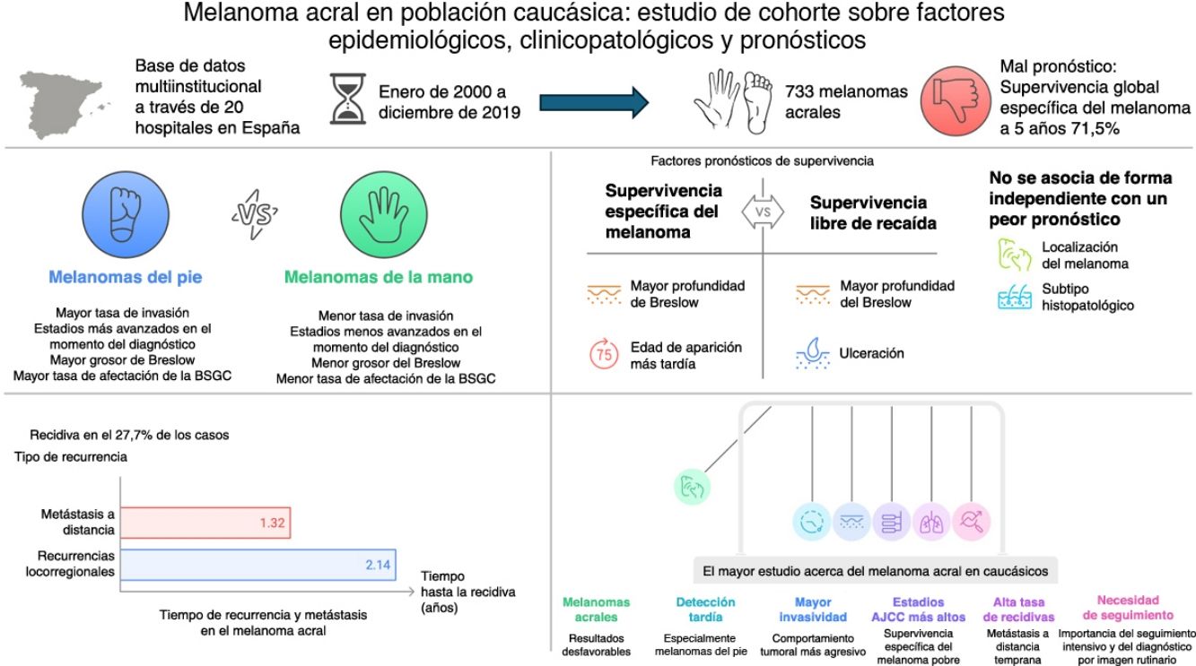 En conclusión, hasta donde sabemos, presentamos el mayor estudio realizado sobre melanomas acrales en una población predominantemente caucásica. Se diagnosticó un número significativo de casos con elevado índice de Breslow, alta prevalencia de ulceración, estadios avanzados y baja prevalencia de melanomas asociados a nevus. Los melanomas originados en los pies se detectaron más tarde, estaban más asociados a nevus, presentaban una mayor proporción del subtipo nodular y estadios más avanzados de la 8.ª edición de la AJCC que los originados en la mano. El mayor índice de Breslow y la edad de aparición más tardía fueron factores pronósticos independientes para al SEM, mientras que el mayor índice de Breslow y la ulceración fueron factores de riesgo independientes para la SLR. La localización del melanoma y el subtipo histopatológico no se asociaron a un peor pronóstico. Las recidivas fueron un hallazgo frecuente, con metástasis a distancia que aparecieron antes que las recidivas locorregionales, lo que subraya la importancia del seguimiento exhaustivo y de las pruebas de imagen rutinarias para detectar las recidivas asintomáticas.
