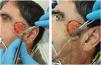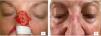 Se recogieron las siguientes variables: la edad categorizada en cuartiles (≤62 años, 63-73 años, 74-80 años y >80 años), el sexo, la presencia o ausencia de enfermedades crónicas (hipertensión arterial o diabetes), el uso o no de fármacos anticoagulantes y la localización anatómica del defecto quirúrgico. Se incluyeron un total de 21 localizaciones diferentes y, a continuación, se clasificaron en 2 grupos en función de los resultados de un análisis de correspondencia (Anexo A). El grupo n.° 1 incluía el pie, la sien, el cuero cabelludo, la mejilla, la pierna, la frente y la región preauricular. El grupo n.° 2 incluía el pabellón auricular, la nariz, el canto interno del ojo, la mano, la región retroauricular y el lecho ungueal. Las figuras 3 y 4 ilustran ejemplos de heridas en 2 localizaciones diferentes (nariz y cuero cabelludo) con las correspondientes imágenes pre- y postoperatorias. También se registró el tipo de cirugía según 2 modalidades (cirugía convencional o cirugía de Mohs en diferido y cirugía de Mohs convencional) y el tamaño del defecto quirúrgico. Para el análisis de esta última variable, se consideró que los defectos tenían forma elíptica y el área se calculó midiendo el diámetro mayor y menor del defecto. Así, se definieron 2 categorías en función de si el área del defecto quirúrgico era ≤5,28m2 o >5,28cm2. Se calculó un punto de corte de 5,28cm2 mediante el método de árbol de clasificación y regresión (Anexo A). Este punto de corte permitió discriminar entre un tiempo de cicatrización≤66 y >66 días.