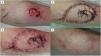 Colgajo Pacman tipo 3 para la reconstrucción de un carcinoma basocelular localizado en la pierna. A) Colgajo Pacman diseñado con una boca asimétrica y la extirpación del tumor con márgenes de 4 mm. B) El colgajo y la movilización de la piel circundante no fueron suficientes para cubrir completamente el ancho del defecto, mientras que fueron más que suficientes para cubrirlo en longitud. Por lo tanto, la mandíbula inferior de la boca del colgajo se tuvo que girar sobre sí misma de forma logarítmica. Esto permitió cubrir completamente el defecto quirúrgico. C) El colgajo presentó una necrosis epidérmica de la punta, pero no requirió realizar más procedimientos ni ninguna cura de forma específica. D) A los cuatro meses se observa un buen resultado con una gran satisfacción del paciente.
