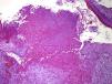 HistopathologyThe lesion was completely excised. Histopathologic examination showed epidermal acanthosis and hyperkeratosis. The superficial and mid dermis contained several granulomas with central areas of necrobiosis surrounded by epithelioid histiocytes, lymphocytes, and multinucleated giant cells. Some of these granulomatous lesions were close to the epidermis and had broken through it, releasing necrobiotic material. Colloidal iron staining revealed mucin deposits (Figs. 2 and 3).