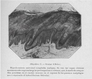 Fig. 5.--Este fotograbado histológico ilustra el caso clínico de la figura anterior. Aparece junto a otra fotomicrografía de un prurigo en una lámina de papel cuché sin número de página entre las páginas 90 y 91 del mencionado número 2 de julio de 1909. Azúa describe en el pie de imagen: «...las capas córneas enormemente engrosadas y las prolongaciones córneas, que, a modo de estaquillas, penetran en el cuerpo mucoso en el espesor de los pezones malpighianos ó siguiendo el infundíbulo folicular.»