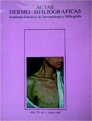 Fig. 9.--Portada de Actas de enero de 1987 (vol. 78, n.º 1), en la que se inserta una imagen clínica en color que servía de avance al contenido de la revista. En el interior, al final del sumario, aparece el diagnóstico: esclerodermia en síndrome tóxico (Hospital 1.º de Octubre). Esta etapa en la que fueron redactor jefe Luis Iglesias Díaz y Francisco Vanaclocha ayudante de redacción marca el principio de la recuperación de Actas tras la crisis de principios de la década de 1980.