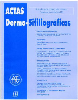Fig. 10.--El diseño de la portada actual data de 1995, poco después de que Evaristo Sánchez Yus y Luis Requena se hicieran cargo de la revista. La recuperación del nivel editorial y del prestigio internacional de Actas Dermo-Sifiliográficas fue una de las principales preocupaciones del entonces presidente de la Academia, Francisco Camacho, quien encargó a Yus y Requena la reactivación y mejora de la revista para poder retornar a las más importantes bases de datos internacionales.
