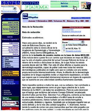 Otro rasgo reciente de Actas pero ya sin duda histórico es la aplicación de las nuevas tecnologías de publicación y comunicación. La publicación en color rara hasta la década de 1990 se hizo cotidiana. El procesamiento digital de los textos y las imágenes es corriente desde hace más de una década, así como el envío electrónico de los manuscritos. Ya desde 1992 uno de los autores de este artículo, Luis Conde-Salazar, recogió los títulos y autores de Actas desde su fundación para su búsqueda sistematizada en una base de datos denominada DERMABASE. En 1998 se publicó por primera vez el volumen completo de Actas Dermo-Sifiliográficas en disco compacto con el patrocinio de la industria farmacéutica (fig. 11). Sin embargo, el mayor avance de estos últimos años ha sido, sin lugar a dudas, la publicación en red de la revista a través de la página www.doyma.es/ad (fig. 12). Las ventajas son indudables: no hay retrasos o extravíos tópicos del correo ordinario hasta llegar a nuestras manos y disponemos de posibilidad de búsqueda amplia, tanto que ya incluso resulta más rápido y práctico localizar y descargar el artículo concreto en formato PDF desde la web de la editorial que buscar entre nuestros propios números de la revista.