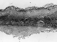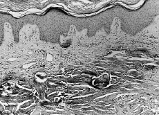 Se efectuó una biopsia cutánea en la que se observa una epidermis sin alteraciones, mientras que a nivel de la dermis media los haces colágenos estaban impregnados de sales de calcio, hallándose algunos histiocitos entre esas fibras calcificadas (Fig. 2).