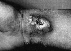 FIG. 1.--Placa en muñeca de consistencia pétrea y centro ulcerado.