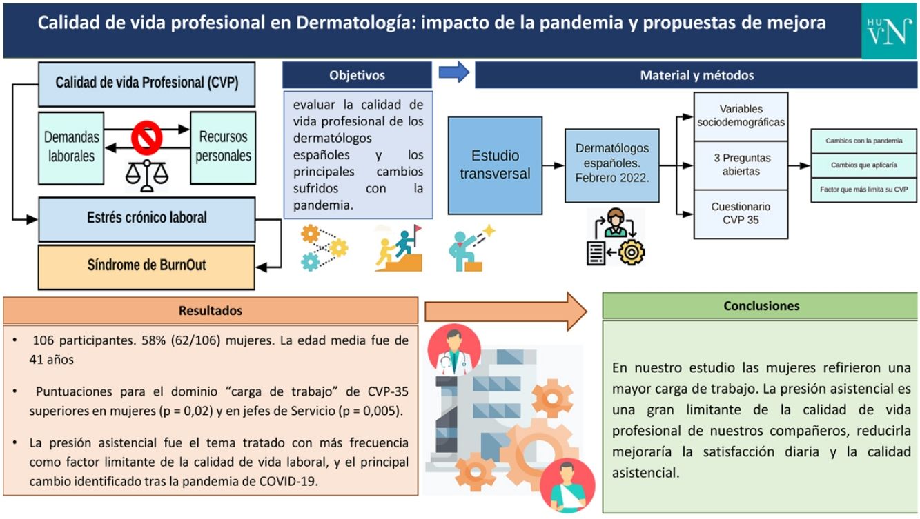 Material and methodsWe designed a cross-sectional study in which Spanish dermatologists were invited to complete an online questionnaire sent out by messaging applications. The dermatologists were asked to provide sociodemographic information, answer 3 open questions, and complete the 35-item Spanish QPL questionnaire (Spanish abbreviation, CVP-35).