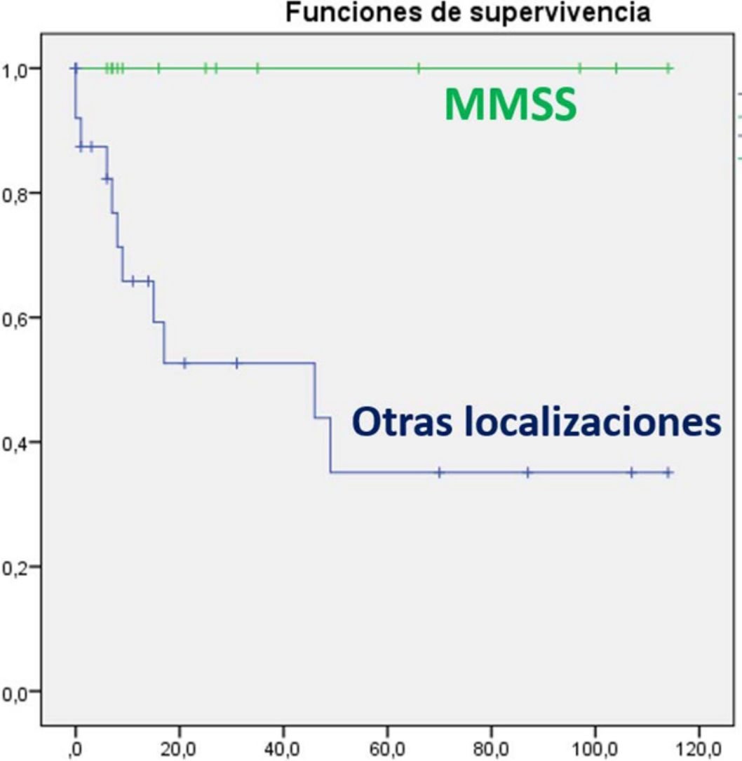 En el análisis univariante ha resultado estadísticamente significativa la edad al diagnóstico, asociándose los pacientes mayores de 70 años a mayor mortalidad (p=0,049). También se ha relacionado con mejor pronóstico la localización en miembros superiores (p=0,005) (fig. 3), presentando estos pacientes una supervivencia del 100% a pesar de tener mayor tamaño medio (4,64cm [SD: 3,98] miembros superiores vs. 3,60cm [SD: 2,41] otras localizaciones). Otros factores que se han relacionado con mayor supervivencia son la realización de ampliación de márgenes (para cualquier margen) tras la cirugía (p=0,011) y la ausencia de afectación ganglionar en cualquier momento de la enfermedad (p=0,023). Además se ha objetivado mayor supervivencia en el sexo femenino aunque sin alcanzar la significación estadística. Al realizar el análisis multivariante, mediante el modelo regresión de Cox, en el que se incluyeron estas 4variables significativas, solo la afectación de ganglios permaneció como factor pronóstico independiente de manera estadísticamente significativa.