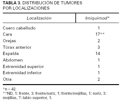 Los resultados obtenidos en nuestra serie son comparables a los observados en la literatura médica. Por primera vez hemos incluido pacientes con carcinoma basocelular de tipo nodular en el régimen de 2 aplicaciones/día, 3 veces a la semana. Destacamos la curación clínica e histológica de un carcinoma basocelular morfeiforme en cara. La revisión de los casos que no respondieron no permite determinar ningún dato predictivo: un carcinoma basocelular superficial en espalda mayor de 1,5 cm de diámetro; tres nodulares de tamaños variable en cara (frente, mejillas y nariz), y uno pigmentado en tronco de 1 cm de diámetro. Dado que un grado moderado de prurito y eritema debe considerarse esperable, cabe destacar el hecho de que 2 de los 3 carcinomas de tipo nodular no curados y el pigmentado no presentaron ningún tipo de reacción inflamatoria local. No puede afirmarse si se trata de una ausencia idiosincrásica de respuesta o de una falta de cumplimiento del tratamiento.