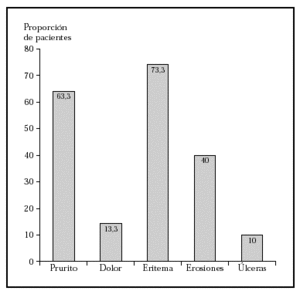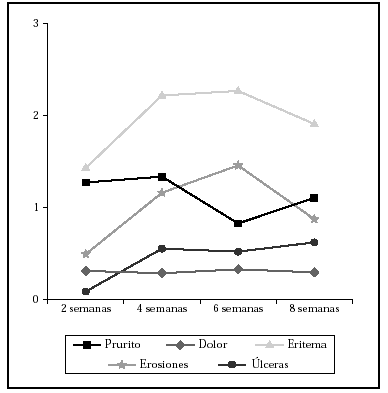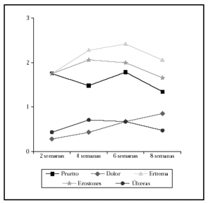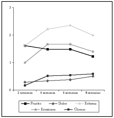 Se realizaron controles cada 2 semanas durante el tratamiento, valorando con una puntuación de 0 (ausencia) a 3 (reacción grave que interfería en la actividad diaria) los siguientes síntomas y signos: prurito, dolor, eritema, erosiones y úlceras. En cada control se fotografió la lesión y se preguntó al paciente por el cumplimiento del tratamiento, la forma y la pauta de aplicación. Se registraron también otros efectos secundarios distintos de los tipificados en el estudio.