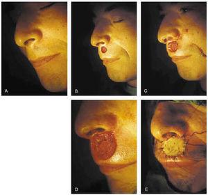 Fig. 7.--Extirpación de epitelioma basocelular esclerosante de labio superior mediante cirugía de Mohs. Se precisaron tres pases para su completa extirpación. Cierre del defecto con injerto de piel total.