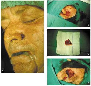 Fig. 13.--A: epitelioma basocelular esclerosante en nariz. B: primer pase. Bordes afectados. C: segundo pase. Bordes libres. D: cierre del defecto mediante injerto de piel total.