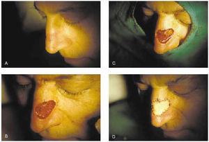Fig. 9.--A: epitelioma basocelular recidivante extirpado mediante cirugía de Mohs. B: curetaje del tumor y primer pase de cirugía de Mohs. C: y D: detalle del segundo pase y resultado final.