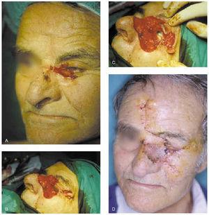 Fig. 14.--A: epitelioma basocelular esclerosante afectando el canto interno del ojo. B y C: se precisaron cuatro pases de cirugía de Mohs. En los dos últimos pases la afectación se localizó a nivel de la grasa periférica del recto interno. D: reconstrucción mediante colgajos de avancerotación de mejilla, transposición glabelar bilobulado e injerto en la zona nasal. Buen resultado funcional del párpado.