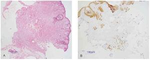 Fig. 15.--A: epitelioma basocelular (tinción con hematoxilina-eosina). B: inmunohistoquímica con citoqueratinas AE1-AE3.