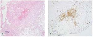 Fig. 16.--A: dermatofibrosarcoma protuberans (tinción con hematoxilina-eosina). B: inmunohistoquímica con CD34.
