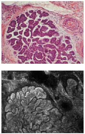 Fig. 17.--A: epitelioma basocelular sólido. Visión de la tinción de hematoxilina-eosina al microscopio. B: visión del mismo corte con el microscopio confocal. (Cortesía de Milind Rjadhyaksha y Salvador González, Harvard Medical School, Boston, EE.UU.).