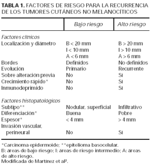 Factores derivados del propio tumor. El tipo de tumor, la definición de los márgenes, su patrón de crecimiento, si es primario o recurrente, la aparición o no sobre lesión previa (por radioterapia o inflamación crónica), el tamaño del tumor, la localización anatómica, el tipo histológico, el grado de diferenciación, la profundidad de invasión y la existencia o no de afectación vascular o perineural. El perfil obtenido con estos datos, permite clasificarlos como de alto grado o bajo grado (tabla 1). Los tumores de alto grado tendrán más probabilidades de recidivas y metástasis que los de bajo grado y requerirán por tanto tratamientos más agresivos.