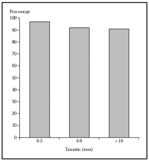 Fig. 1.--Porcentaje global de curación de epiteliomas basocelulares primarios con cirugía según el tamaño. Tomada de Rowe et al1.