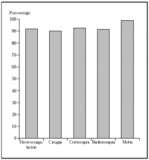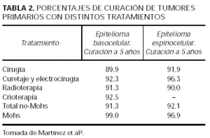 Radioterapia. Es una terapia destructiva muy utilizada en el tratamiento, sobre todo del carcinoma basocelular. También se utiliza ampliamente como adyuvante de la intervención quirúrgica en determinados tumores sensibles a la radioterapia. Su principal inconveniente es la falta de control de los márgenes. Un estudio reciente que trata epiteliomas basocelulares y espinocelulares recidivantes con radioterapia encuentra un porcentaje de curación a los 5 años del 83 %16. Las revisiones clásicas ofrecen unos porcentajes de curación a los 5 años del 91,3 %1 en los epiteliomas basocelulares primarios y del 90,2 % en los recurrentes8,17.