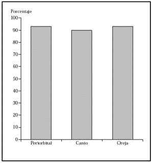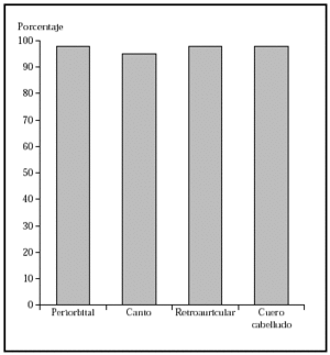 Fig. 5.--Porcentaje global de curación de epiteliomas basocelulares recurrentes en distintas localizaciones con la cirugía de Mohs. Tomada de Rowe et al1.