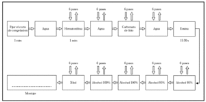 3. Corte de la pieza. El criostato se prepara a una temperatura entre 25 y 30 °C con cortes de 6 m de espesor. Cada una de las secciones es invertida de forma que el fondo de la pieza quede en la parte de arriba. El tejido es colocado sobre OCT y presionado ligeramente con el extractor de calor, para obtener una superficie lisa y uniforme. Al cortar cada una de las secciones debe intentarse que los primeros cortes sean útiles ya que, si se profundiza mucho, se obtienen falsos positivos.