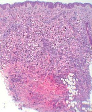 Figura 3. Infiltración celular densa e infiltrante en dermis y tejido celular subcutáneo. (Hematoxilina-eosina, x4.)