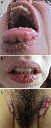 (A, B) Painful white verrucous papules, fissures, erosions, and crusts on the vermillion border of the lips and the hard palate (cobblestone pattern); sulci and gyri on the dorsum of the tongue (cerebriform tongue). © Oozing, raised erythematous plaques with a verrucous surface on the inguinal folds.