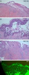 Histological examination of one of the flaccid blisters on the back revealed an intraepidermal blister and suprabasal acantholysis (Fig. 2A), as well as a dense epidermal and dermal inflammatory infiltrate, rich in neutrophils and eosinophils (Fig. 2B). Histological examination of the left inguinal vegetating plaque showed identical findings, in addition to pseudoepitheliomatous epidermal hyperplasia (Fig. 2C). Direct immunofluorescence of perilesional skin showed intercellular staining of the epidermis by immunoglobulin (Ig) G deposits (Fig. 2D).