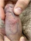 A 27-year-old man with no significant medical history presented to the dermatology office with a five-month-old history of a dermatosis that involved the ventral surface of his penis, the back and abdomen. Further questioning revealed a self-limited flu-like syndrome with fever and myalgias that preceded the appearance of the skin lesions, approximately 2 weeks after an unprotected sexual intercourse with another male. The dermatosis first appeared as pruriginous vesicles, evolving into an umbilicated papules that later formed a scab that fell shortly after. At that time the patient came out positive in a swab for Mpox. Physical examination found an erythematous ulcerated scar with 3mm of larger axis with associated cutaneous retraction on the ventral aspect of the penis (Fig. 1). The patient referred pruritus and pain due to retraction at this site asking for therapy. This scar scored 8 points in the Modified Vancouver Scar Scale (mVSS). The other lesions on the body left only post inflammatory hyperpigmentation at most.