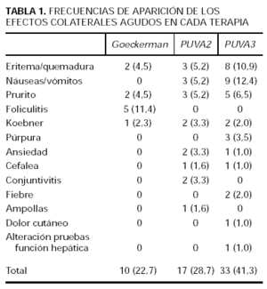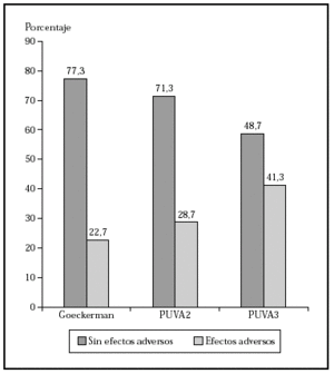 Las náuseas y vómitos únicamente se presentaron en pacientes sometidos a PUVAterapia, lo que no es de extrañar, pues es un efecto secundario relacionado con la ingesta del psoraleno. Por el contrario, sólo presentaron foliculitis pacientes que recibían terapia de Goeckerman, hecho que no resulta sorprendente, pues su aparición se asocia al empleo del alquitrán de hulla.