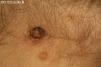 Molluscum contagiosum is caused by a member of the poxvirus family, and manifests clinically as a flesh-colored or translucent, pearl-like papule with an umbilicated center measuring 1 to 5 mm in diameter.3 The most frequently affected areas are the trunk, the limbs, and the scalp. The diagnosis of this disorder is clinical. A pathology study is performed only occasionally, when the diagnosis is uncertain. Histology reveals a well-defined hyperplastic lesion of the epidermis sometimes with a central crater, and, commonly, eosinophilic inclusion bodies within the keratinocytes that later become basophilic inclusion bodies as they rise in the epithelium.4 Molluscum contagiosum infection results in benign lesions that usually resolve spontaneously, although this may take months to years.5 Treatment is the subject of debate. Because of the self-resolving nature of the disease, one option is no treatment. The aim of active treatment is to prevent contagion and autoinoculation. A number of treatment approaches exist, but these are all the subject of debate and none are free of risk; some examples include topical treatments (e.g., cantharidin, potassium hydroxide 5%, salicylic acid, imiquimod, tretinoin, podophyllotoxin, topical cidofovir, tincture of iodine, trichloroacetic acid) and physical treatment with cryotherapy, curettage, electrosurgery, or laser.6,7