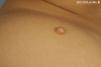 Case 2A 2-year-old boy with no relevant history was brought for consultation due to a lesion on the right shoulder which had developed in the first 4 days of life and had grown over the previous months. He had been born following a full-term pregnancy and vaginal delivery. The mother was healthy and had no history of cutaneous lesions. An examination revealed a single papule 6 mm in size on the right shoulder. The papule had well-defined borders, was the color of normal skin, and had a slightly umbilicated center (Fig. 2). Based on a clinical suspicion of molluscum contagiosum, curettage was performed of the lesion following application of a topical anesthetic cream. The procedure was carried out with ease and the lesion was removed completely. The pathology findings were consistent with molluscum contagiosum (Fig. 3).