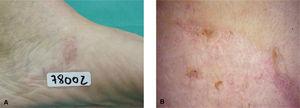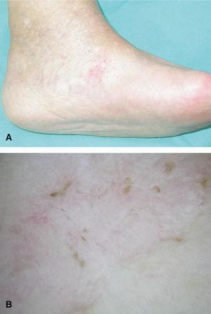 Una mujer de 69 años, sin antecedentes personales de interés, consultó por una lesión asintomática en la cara interna del pie izquierdo de 2 años de evolución y que había tratado con una pomada de propionato de clobetasol de forma esporádica sin obtener respuesta.