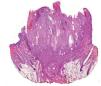 Detalle de la figura 3. Queratinización sin capa granulosa, dando lugar a una queratina compacta, eosinófila y ortoqueratósica. Eosina-hematoxilina, x200.