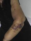Cutaneous angiosarcoma is a very rare tumor, evidenced by the fact that we were only able to collect data on 16 tumors diagnosed over a period of 14 years at an oncology hospital. Overall, cutaneous angiosarcoma is somewhat more common in elderly men. This is because the most common form of cutaneous angiosarcoma in the general population is primary head and neck angiosarcoma (also known as idiopathic or Wilson-Jones angiosarcoma)(Fig. 1), which tends to affect elderly men.5,7,17 Postradiation angiosarcoma (Fig. 2) is now the second most common form of cutaneous angiosarcoma due to the increased use of radiation therapy as opposed to radical mastectomy to treat breast cancer.2,13,18 This change has also led to a reduction in the frequency of lymphedema-associated angiosarcoma, which is currently the least common form of this tumor. The prevalence of the different forms of cutaneous angiosarcoma in our series does not coincide with reports in the literature as our hospital treats a large number of women with breast cancer, explaining why the most common form of cutaneous angiosarcoma at our hospital was postradiation angiosarcoma. This predominance of breast cancer cases also explains why 11 of the 16 patients were women. There was just 1 case of lymphedema-associated angiosarcoma (Fig. 3), which does coincide with prevalence rates reported elsewhere. The patient had chronic lymphedema of the left arm secondary to axillary lymph node dissection performed as part of breast cancer treatment 22 years earlier.