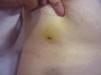 Tumor size is currently the most widely accepted prognostic marker for cutaneous angiosarcoma, and it has been frequently reported that angiosarcomas measuring 5cm or more have a worse prognosis than smaller tumors.5,17 In our series, we observed differences in mean tumor size between survivors and nonsurvivors. Those who survived had a mean tumor size of 3.6cm, which was over 3 times smaller than the mean size (13.1cm) in the group of patients who died. Our results thus support the belief that larger tumors are associated with worse outcomes in angiosarcoma,and highlight the importance of diagnosing the tumor when it starts as a bruise-like lesion, although this is particularly difficult in angiosarcomas of the scalp and even more when the patient still has hair (Fig. 4). Postradiation angiosarcoma of the breast is easier to diagnose, as any persistent lesion in this area with a vascular or bruise-like appearance should be biopsied. One potentially useful diagnostic clue is a yellowish halo (corresponding to hemosiderin) around the suspicious lesion (Fig. 5), as we have never observed this sign in benign vascular proliferations on irradiated skin. Postradiation angiosarcoma and atypical vascular proliferations on irradiated skin must be distinguished histologically but clinical features can help. Atypical vascular proliferations tend to be much smaller than angiosarcomas and they also generally have a shorter latency period.20 Unlike angiosarcomas, these proliferations are confined to the superficial and mid dermis and do not invade the subcutaneous tissue. In addition, histology does not show the characteristic nuclear atypia observed in angiosarcoma, nor the multiple layers of endothelial cells or mitotic figures. Nevertheless, it can occasionally be difficult to distinguish between the 2 entities and there have been reports of the 2 lesions coexisting in the same irradiated breast. There have even been cases of radiation-induced atypical vascular proliferations progressing to angiosarcoma.21 In very complicated cases, it can be helpful to search for overexpression of the MYC gene if an immunohistochemical study is performed, or amplification if fluorescent in situ hybridization is used. MYC amplification is quite common in secondary angiosarcomas, but does not appear to occur in atypical vascular proliferations on irradiated skin.22